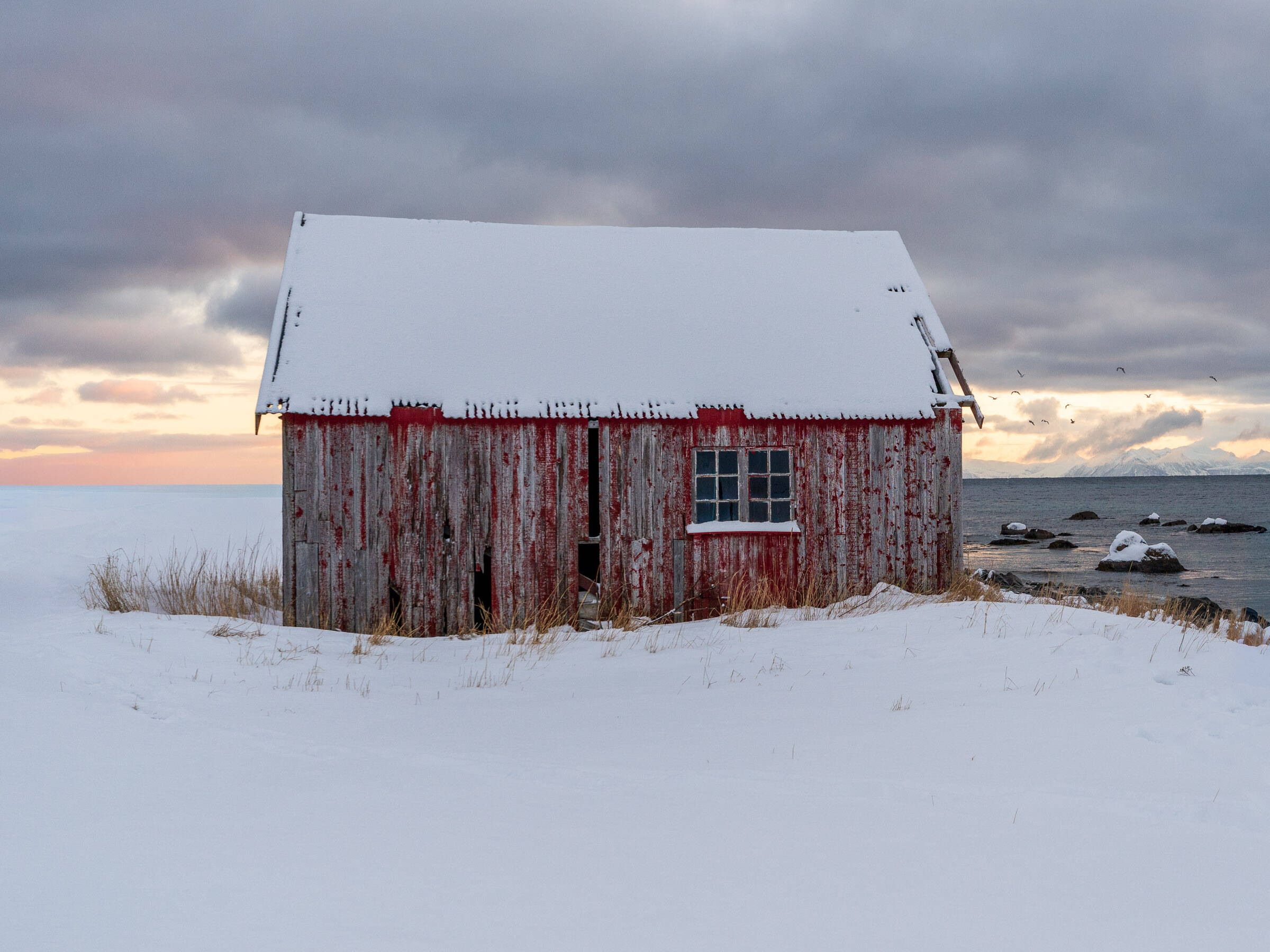 Flott komposisjon, med mange fine linjer og trekanter! Gjentakende trekanter mellom bygg og fjell. Fargen i bygget som går igjen i det gråblå i sjø og himmel er helt nydelig.