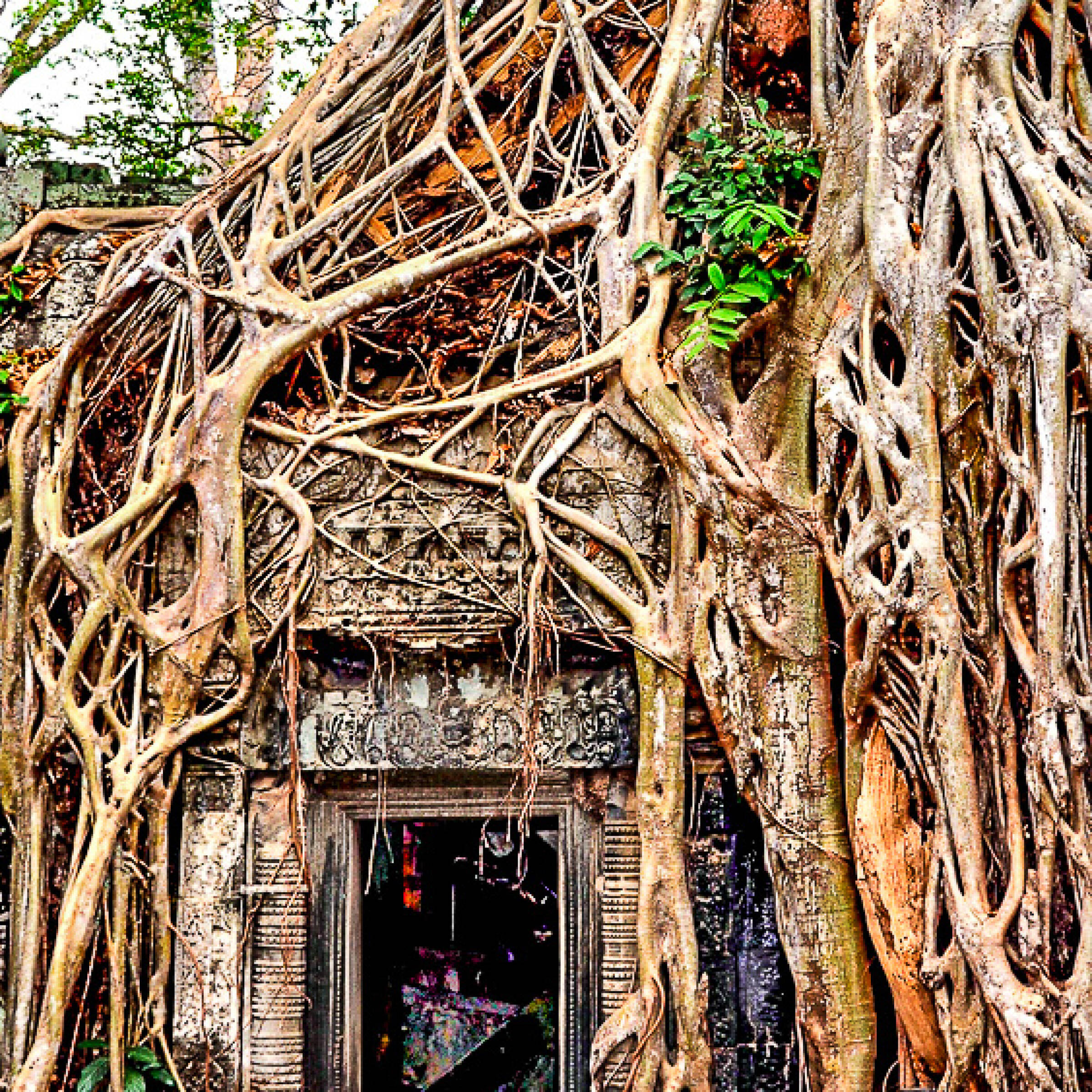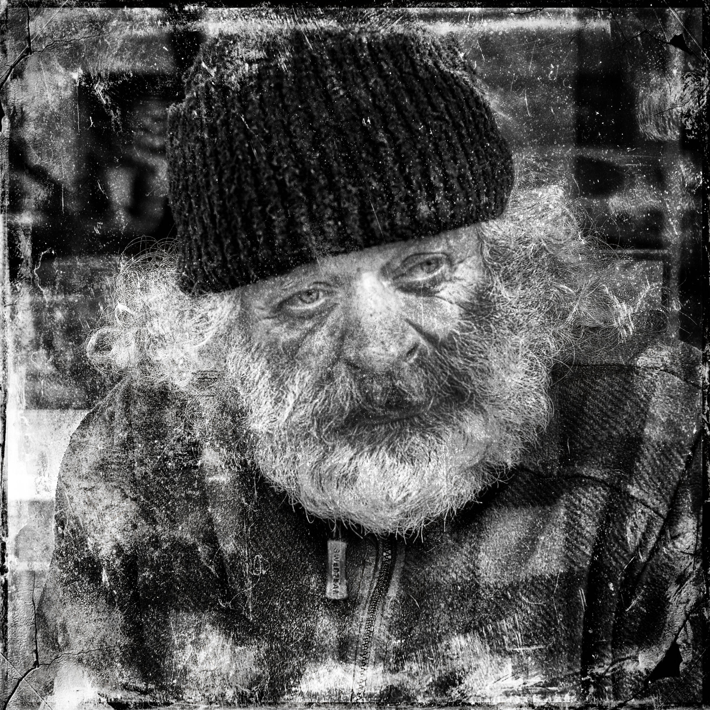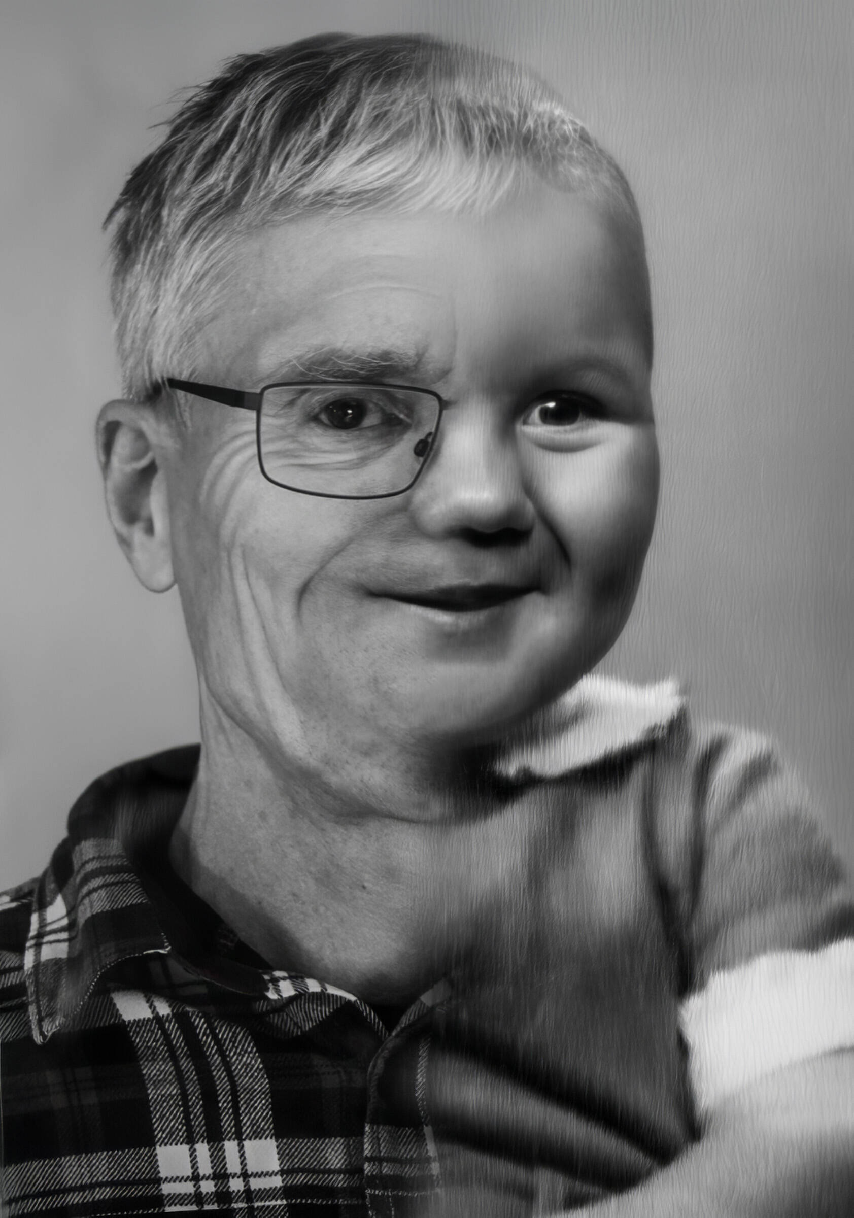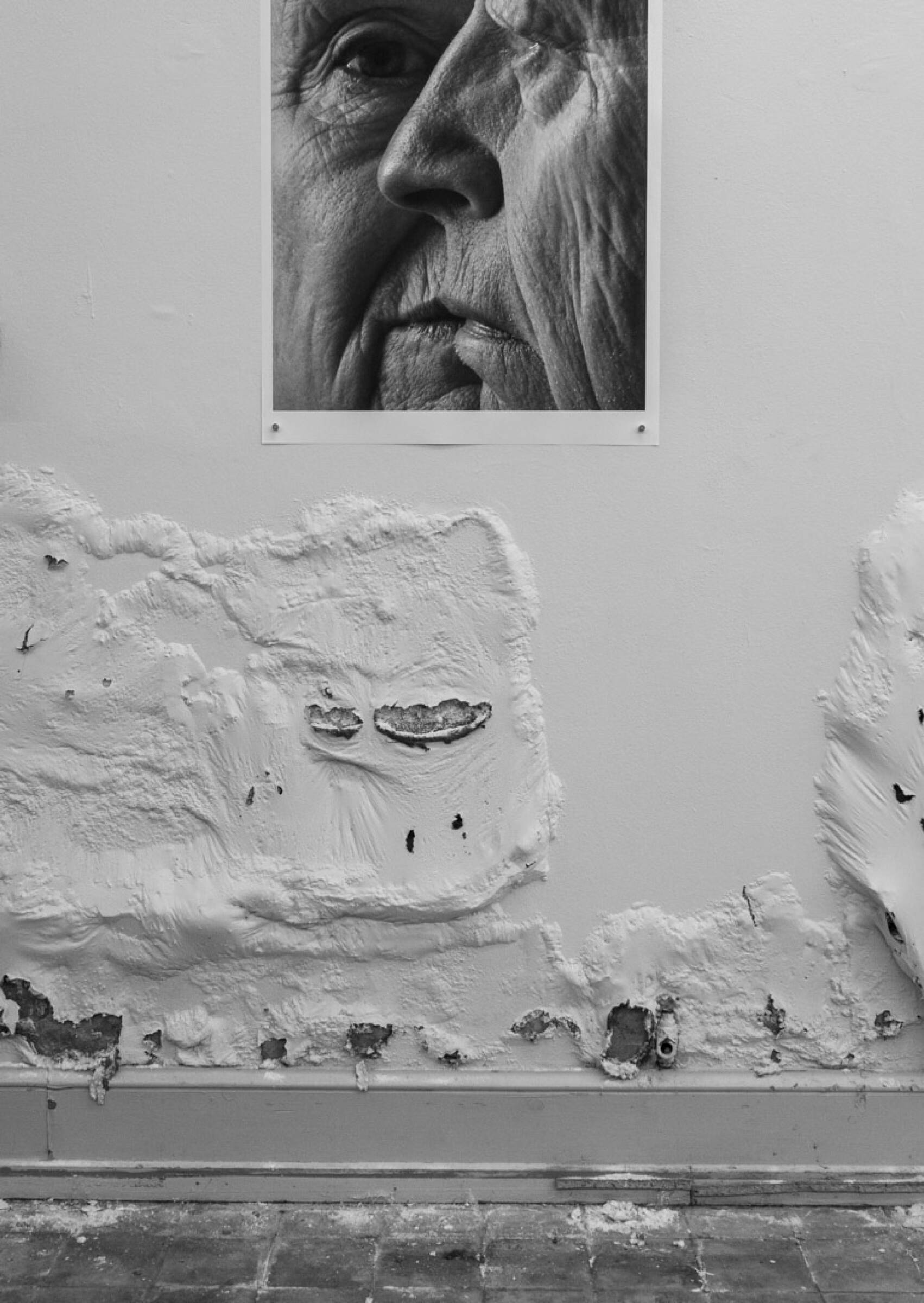 Kunstnerisk og kreativ tolkning av tema. Bildet øverst fremkommer som nytt, men menneskene i bildet henger sammen med den litt "skrukkete" veggen. Vi liker beskjæringen av bildet slik det er gjort, spesielt øverst.
